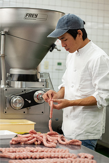 原料の肉処理を行い、生地製造、充填、燻製後、加熱・冷却を経て包装します。
